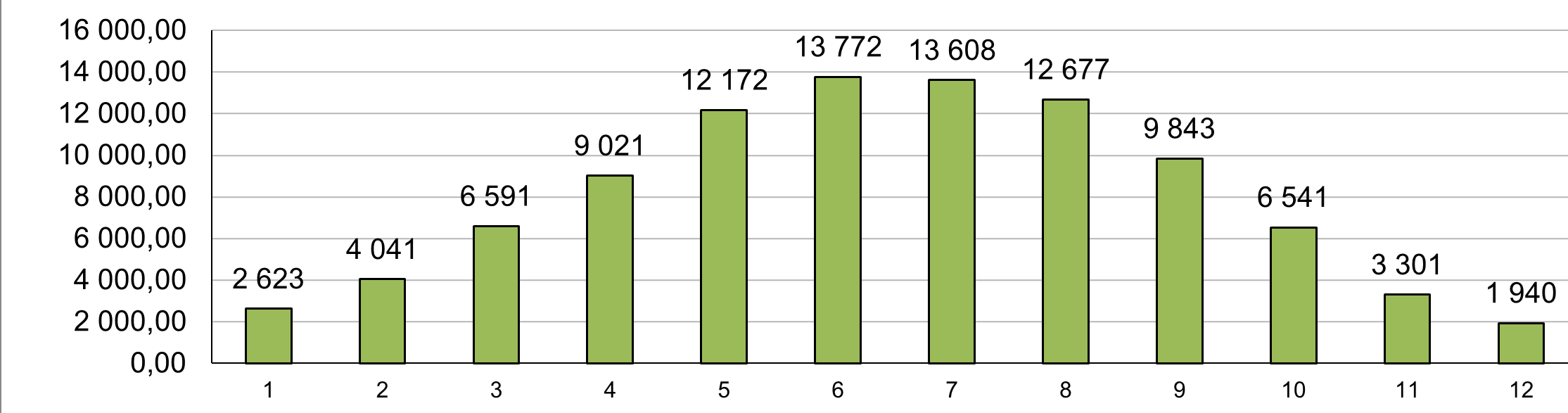 - Минимальная выработка зимой — 62,59 кВт в сутки