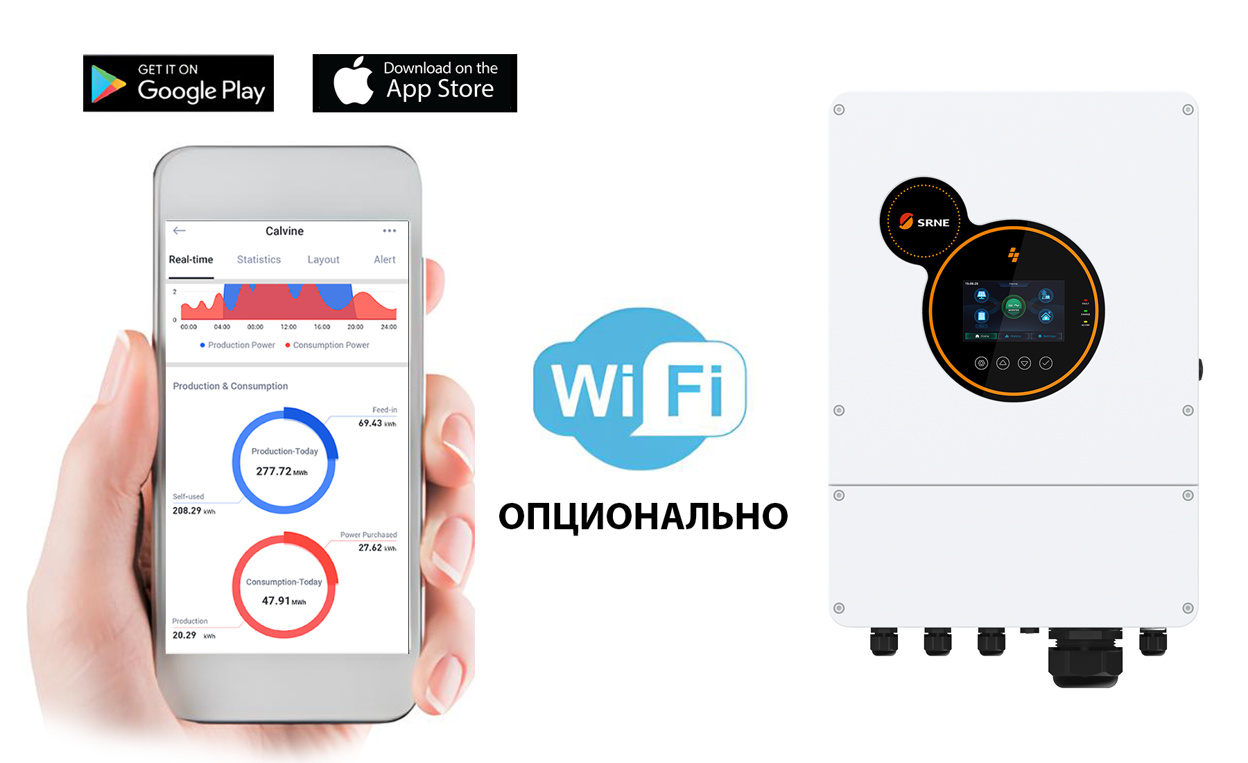 Инвертор поддерживает возможность удалённого мониторинга по Wi-Fi. Для этого требуется установка специального Wi-Fi модуль для инверторов SRNE, который приобретается за отдельную доплату.
