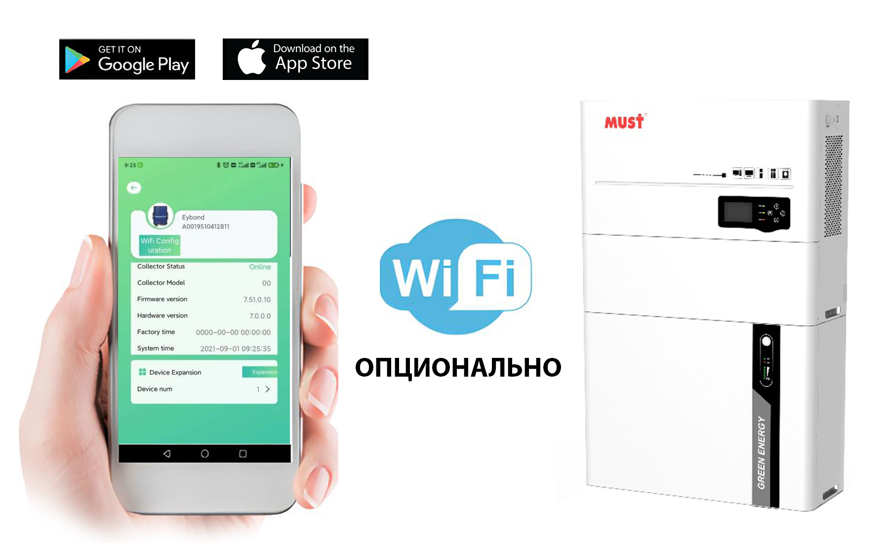 Система накопления энергии MUST HBP18-5548 ESS поддерживает возможность удалённого мониторинга по Wi-Fi. Для этого требуется установка специального Wi-Fi модуля для MUST, который приобретается за отдельную доплату.