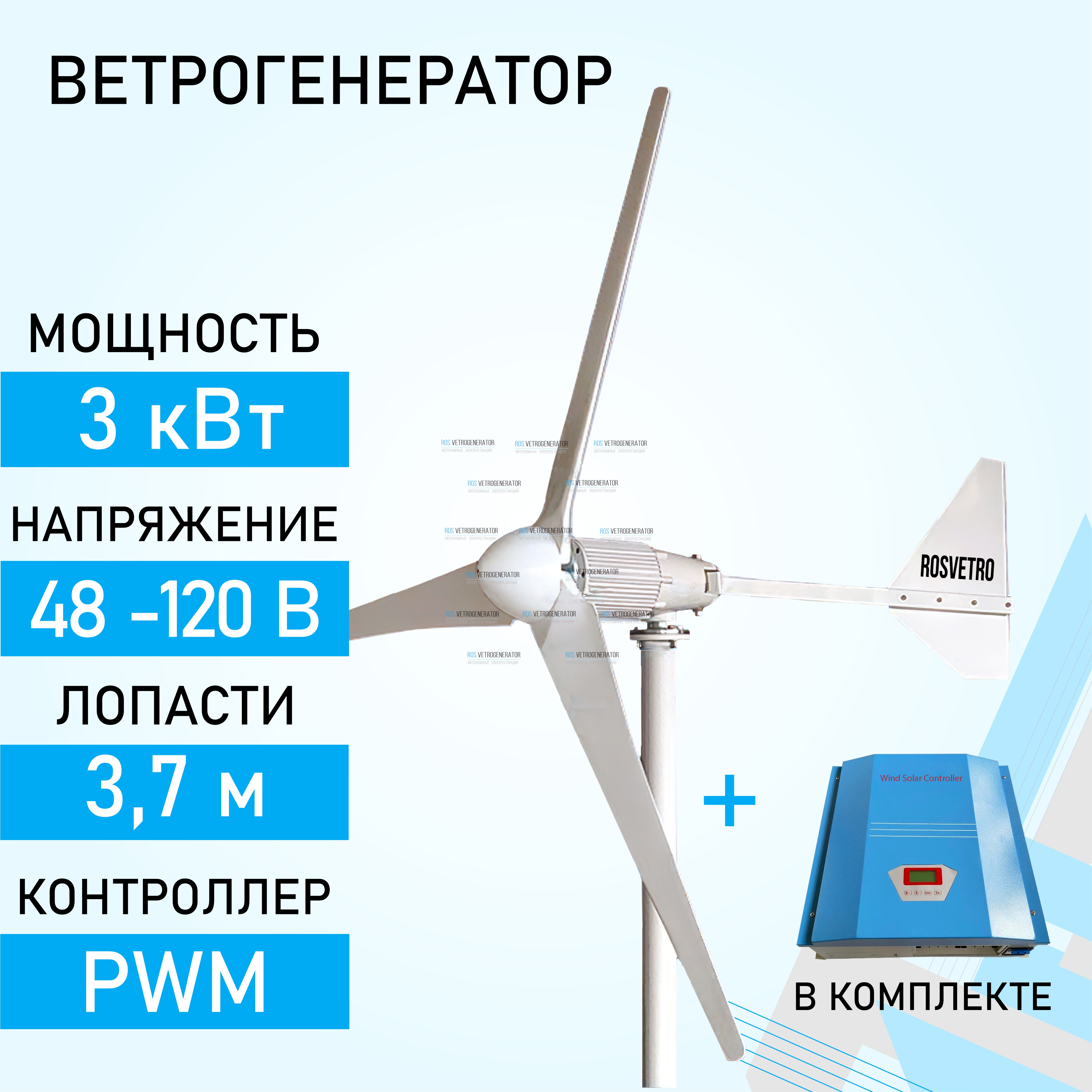 | Комплектация | Ветрогенератор, контроллер, крепежные аксессуары |