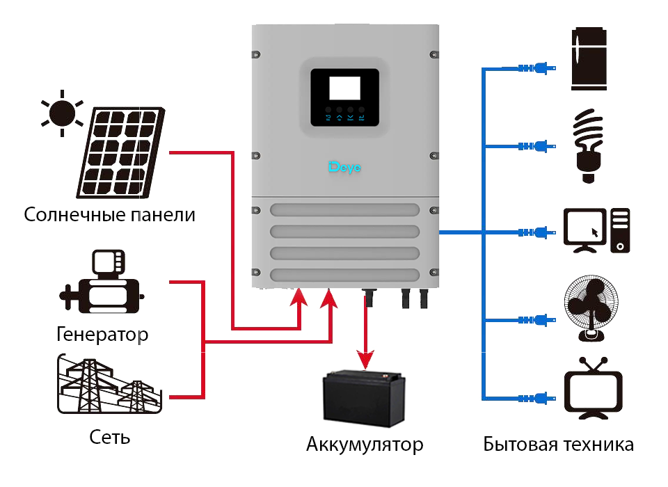 Гибридный инвертор Deye SUN-6K-OG01LP1-EU-AM2 может использовать питание от инверторного генераторного устройства (ИГУ) и дизельного генератора для заряда аккумуляторных батарей. Использование энергии от генератора может быть особенно полезным в отдаленных районах или в условиях непостоянного электроснабжения, обеспечивая стабильное и эффективное энергоснабжение.