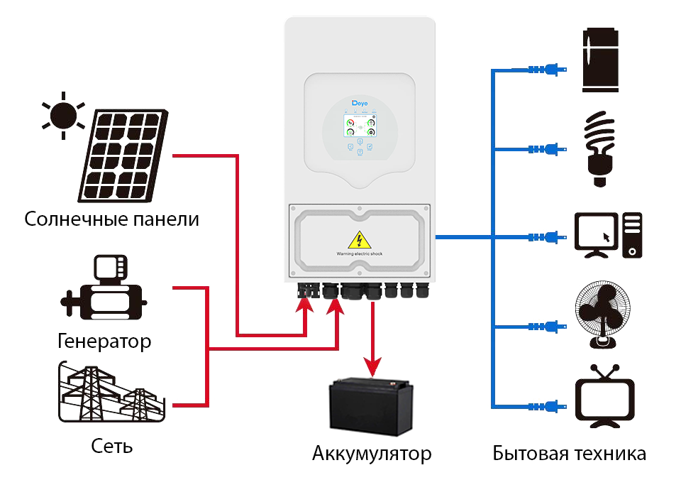Гибридный инвертор Deye SUN-6K-SG03LP1-EU может использовать питание от генераторного устройства (ИГУ) для заряда аккумуляторных батарей. Использование энергии от генератора может быть особенно полезным в отдаленных районах или в условиях непостоянного электроснабжения, обеспечивая стабильное и эффективное энергоснабжение.