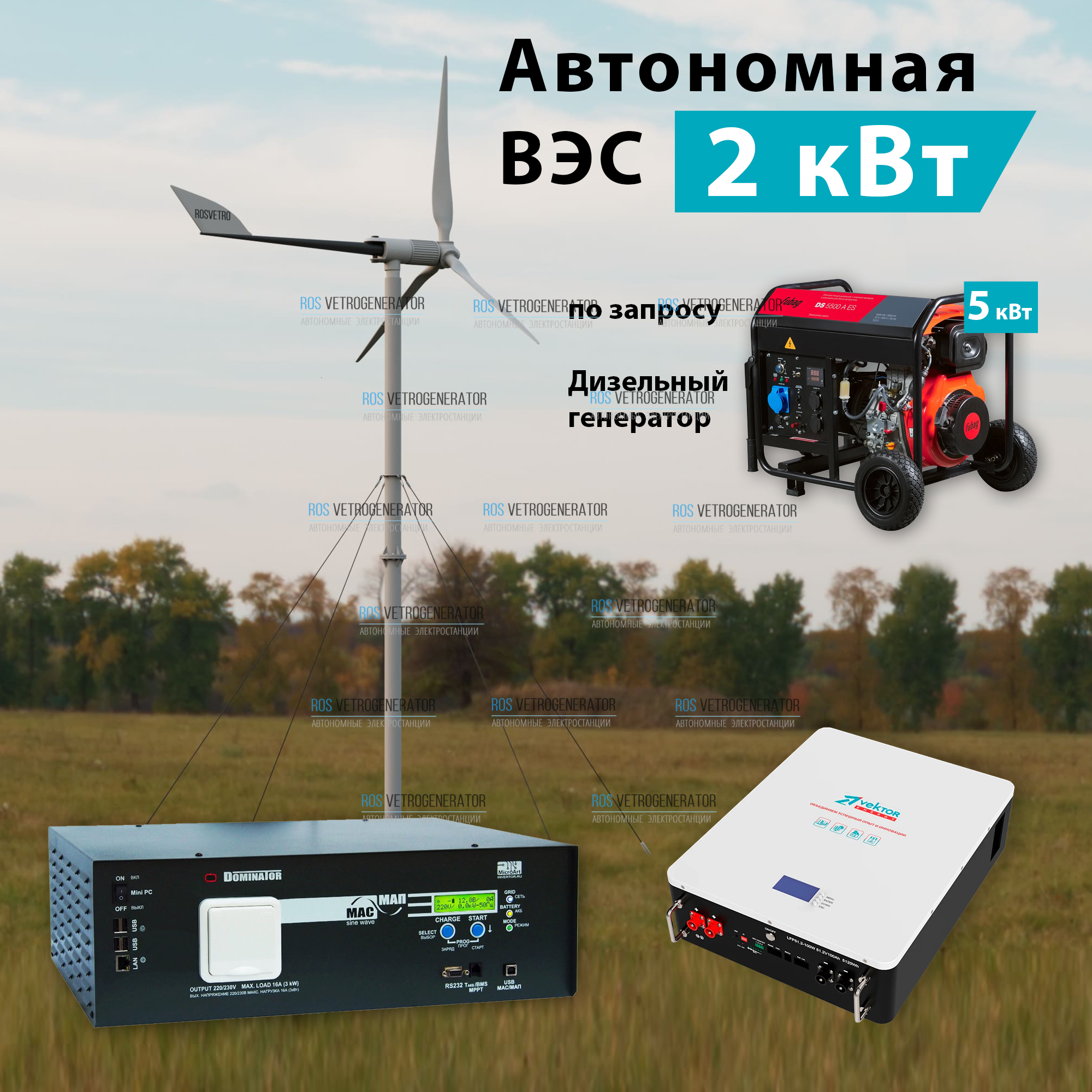 Электростанция ВЭС-2K литий мощность 2 кВт – это надежный и эффективный способ энергоснабжения практически в любом месте, оснащенная различными компонентами для обеспечения надежного, дополненный системой автоматической регулировки выходного напряжения (AVR) и эффективного электропитания в условиях переменных обстоятельств. Этот тип энергетической системы объединяет два источника энергии - ветрогенератор и дизельный генератор, что позволяет обеспечивать стабильное и эффективное электроснабжение.