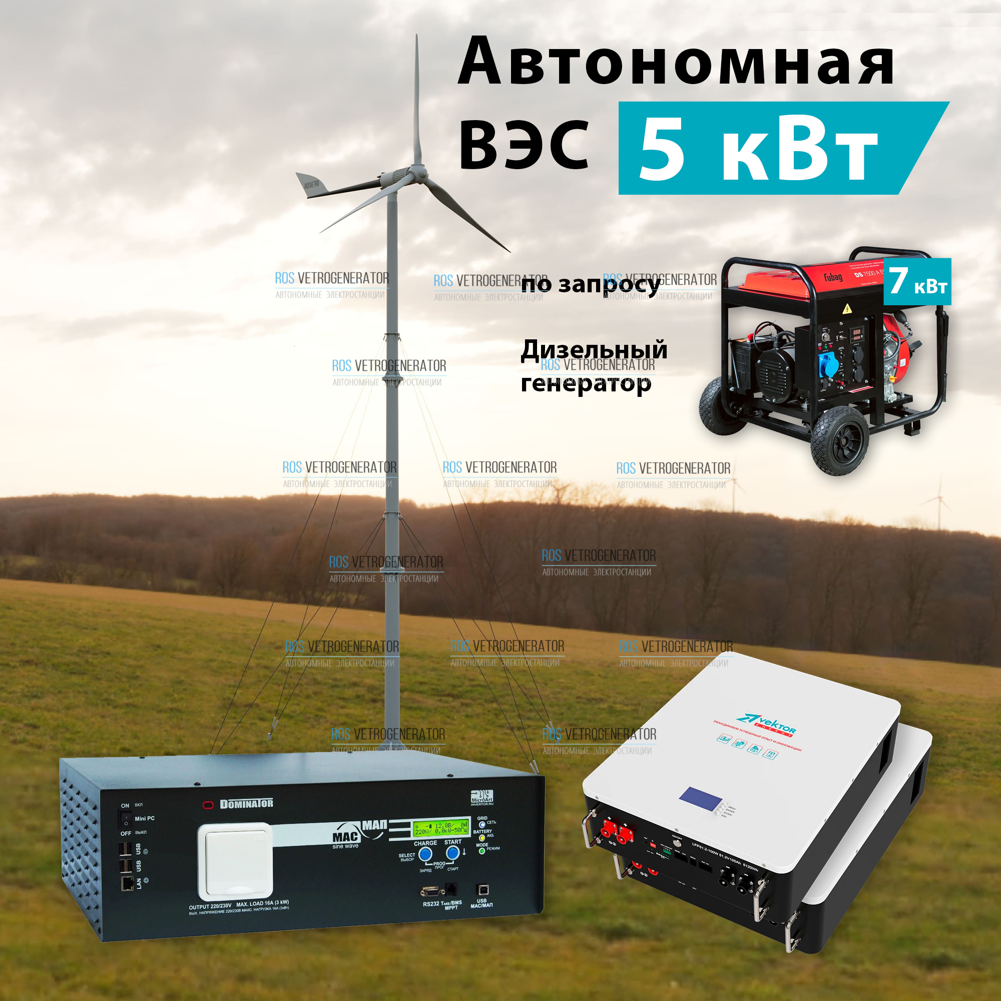 Электростанция ВЭС-5K литий мощность 5кВт – это надежный и эффективный способ энергоснабжения практически в любом месте, оснащенная различными компонентами для обеспечения надежного и эффективного электропитания в условиях переменных обстоятельств. Этот тип энергетической системы объединяет два источника энергии - ветрогенератор и дизельный генератор, что позволяет обеспечивать стабильное и эффективное электроснабжение.